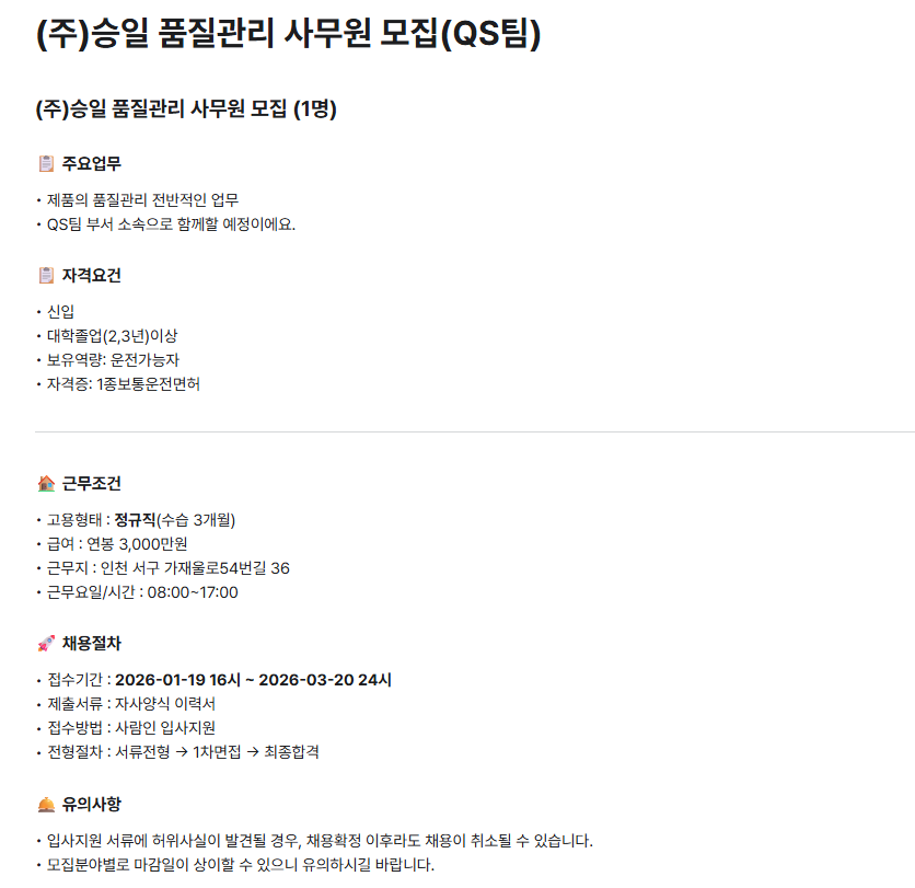 [승일] (주)승일 품질관리(QS팀) 사무원 모집공고 (채용 완료 시 마감)